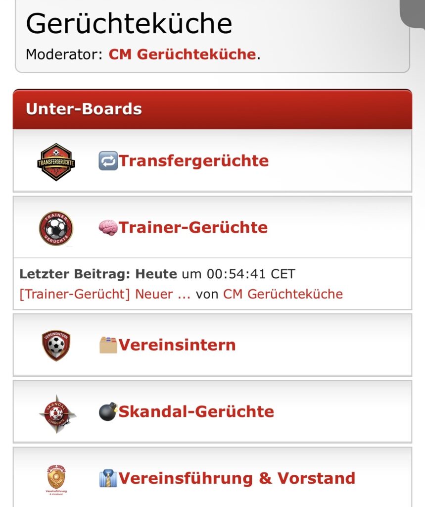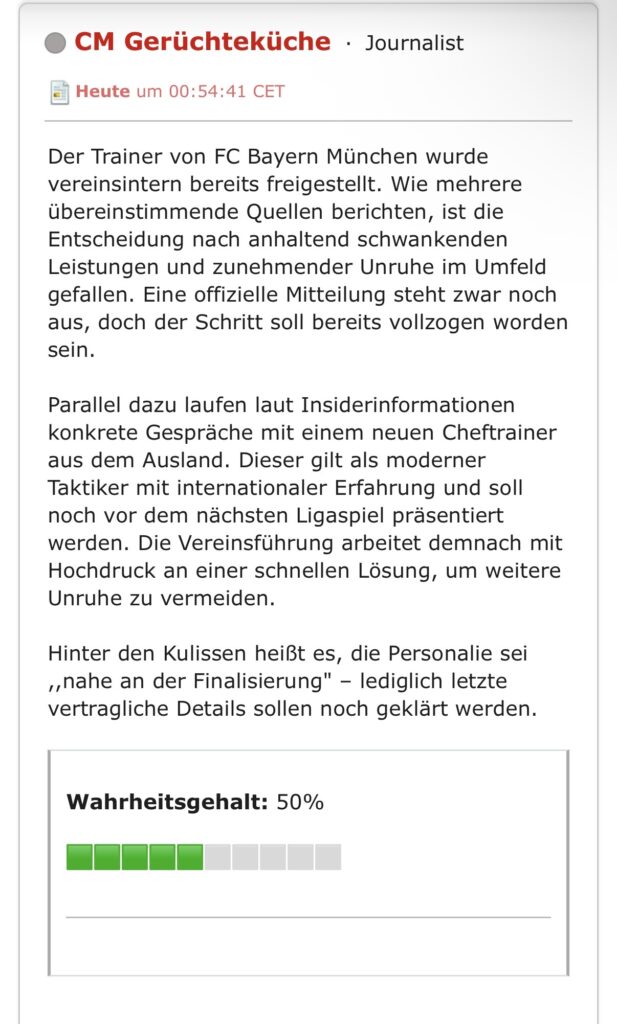 Die Gerüchteküche ist ein fiktives, atmosphärisches Feature des Champions-Managers, das für zusätzliche Spannung, Diskussionen und Realismus sorgt. Hier tauchen regelmäßig neue Spekulationen, Insider-Informationen und vermeintliche Leaks rund um Vereine, Trainer und Spieler auf – ganz so, wie man es aus der echten Fußballwelt kennt.